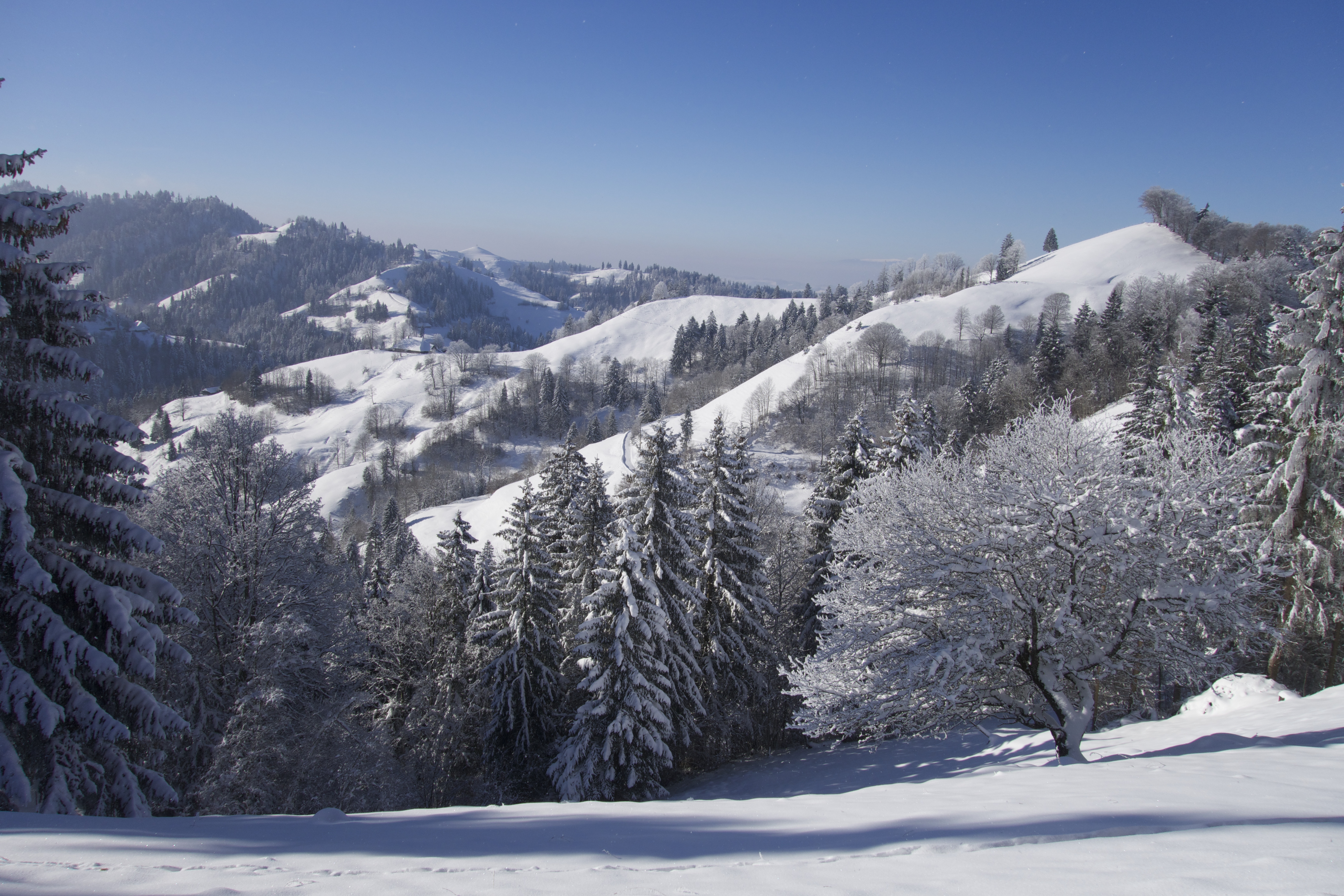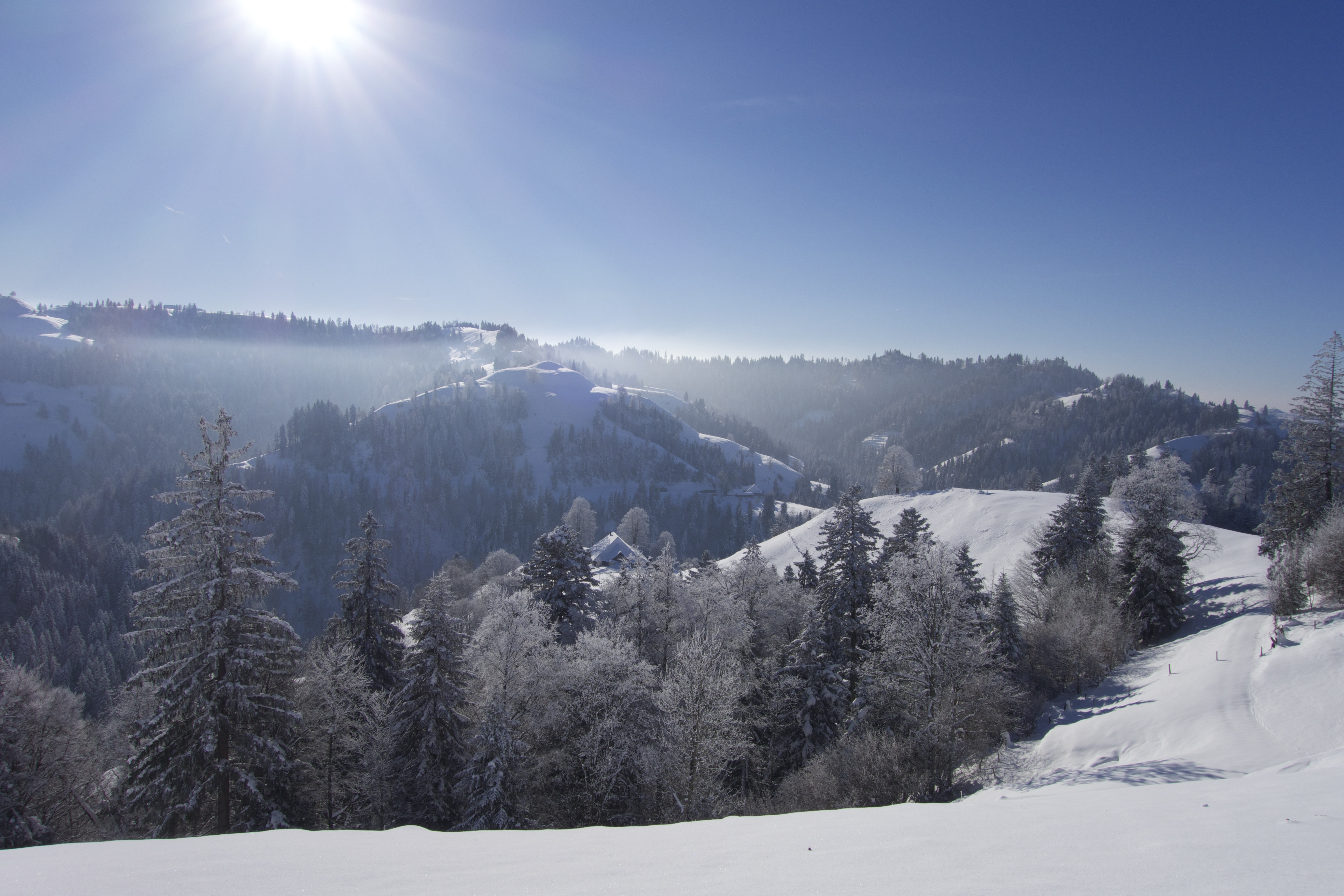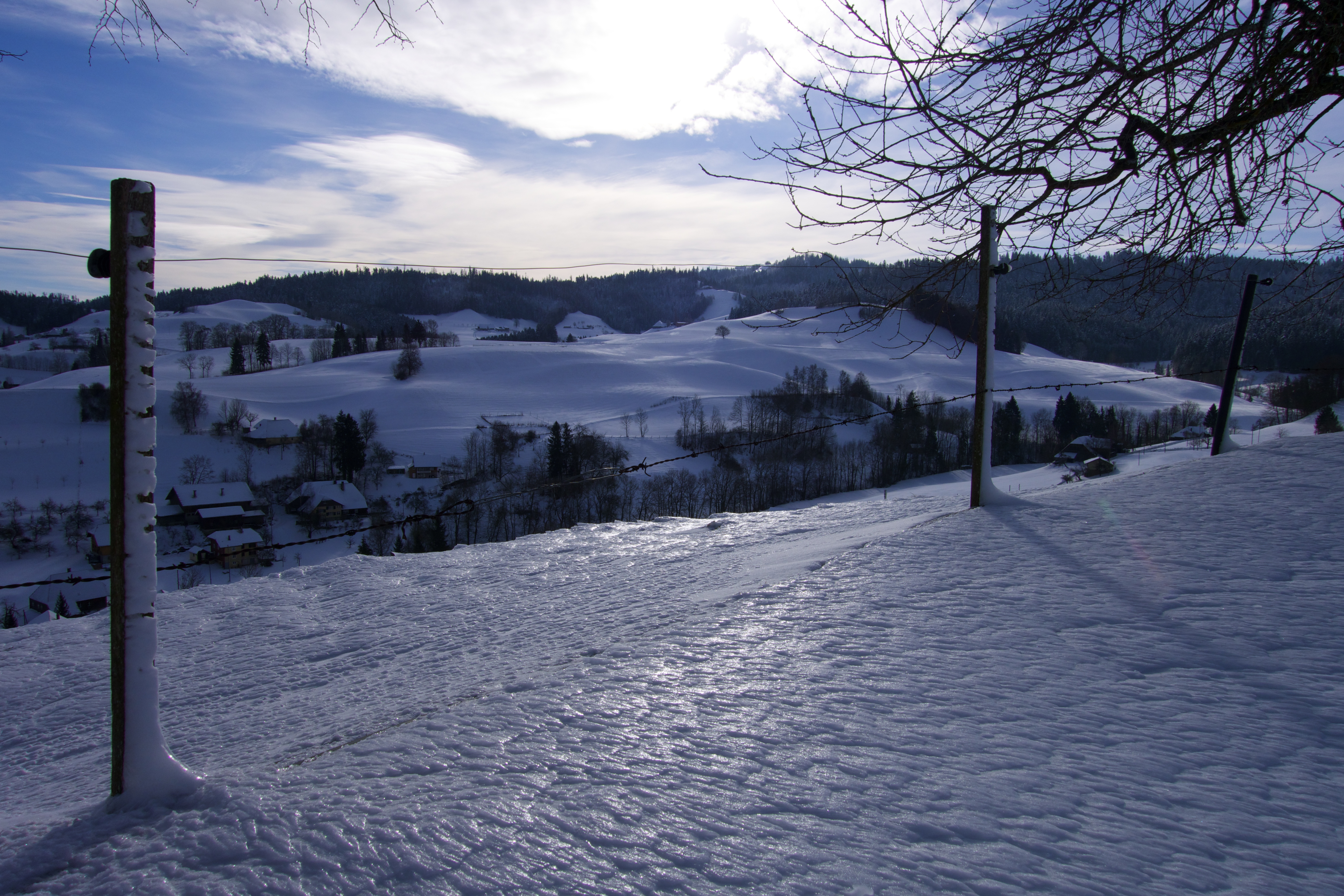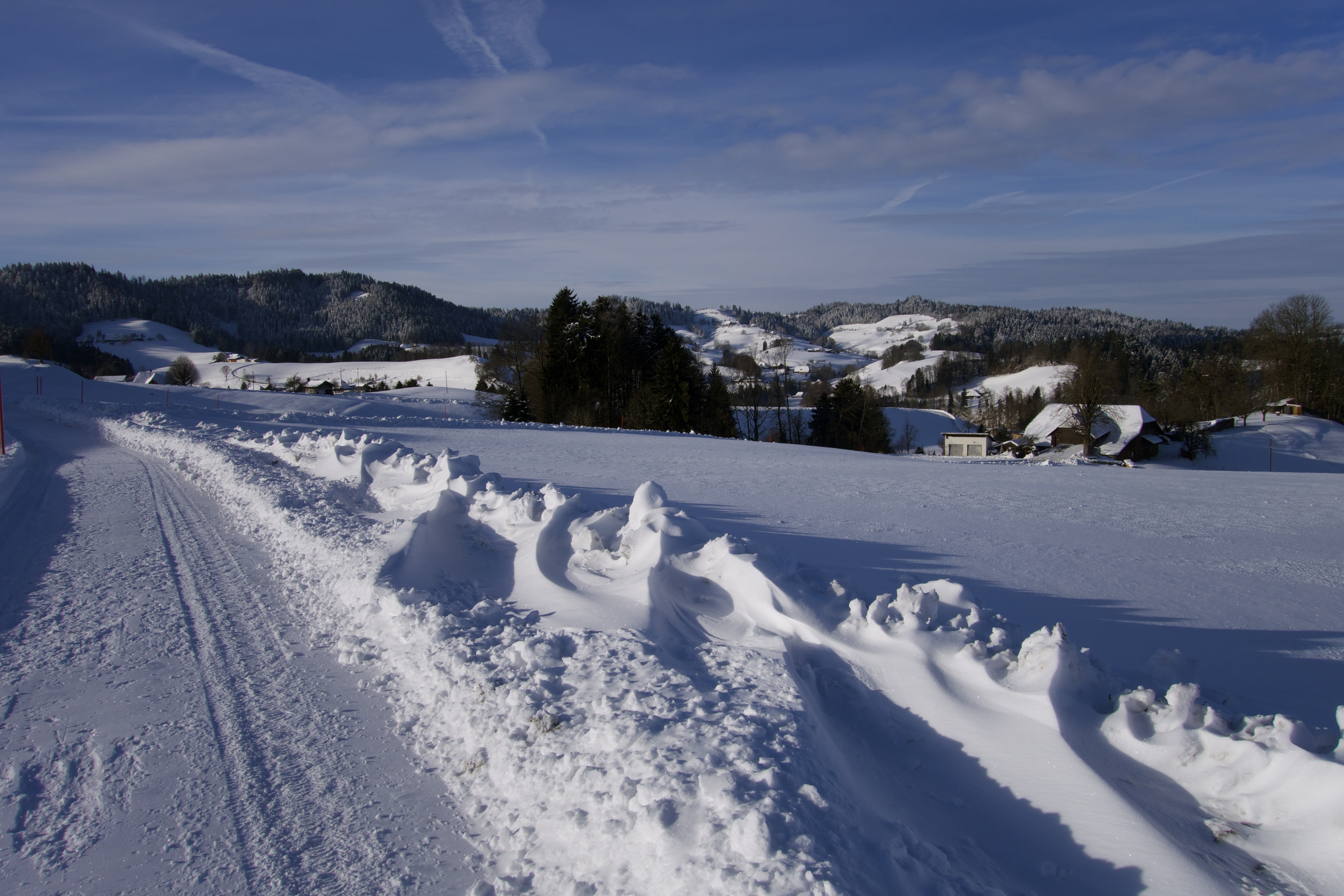 Wandern im Winter. Nirgends geht das besser als im EMMENTAL. Viel Schnee, eine wunderschöne, romantische Landschaft. Stille und Ruhe. Die ideale Gegend, um sich vom Alltag auszuklinken. Bewusst stelle ich mich auf die Lautlosigkeit ein. Jedes Geräusch nimmt man hier wahr. Einen bellenden Hofhund, der sein Revier verteidigt. Weit entfernt eine Motorsäge. Ein Trecker, der von einem abgelegen Hof weg tuckert. Die Kirchenglocken, und ab und zu ein Auto.