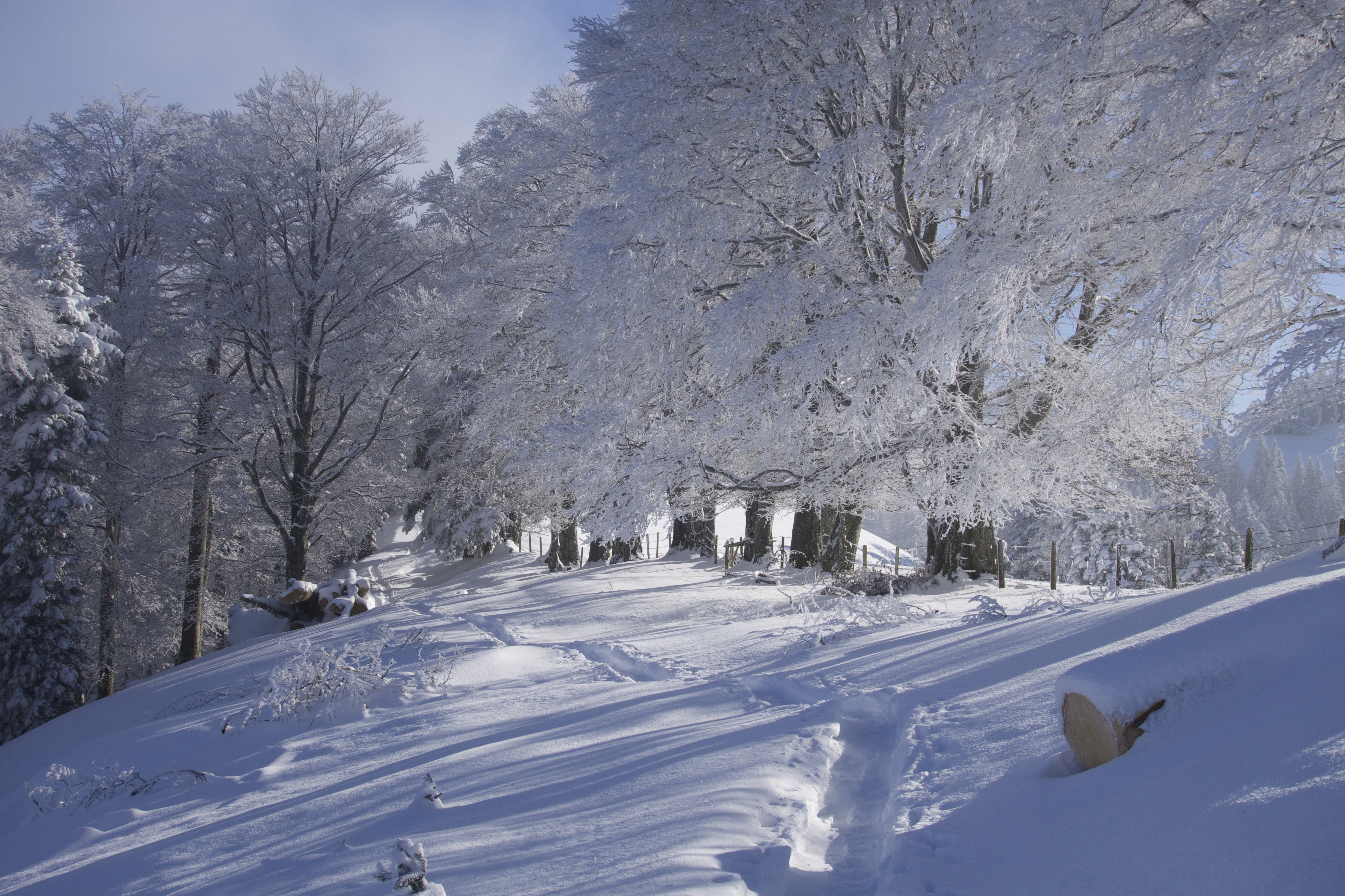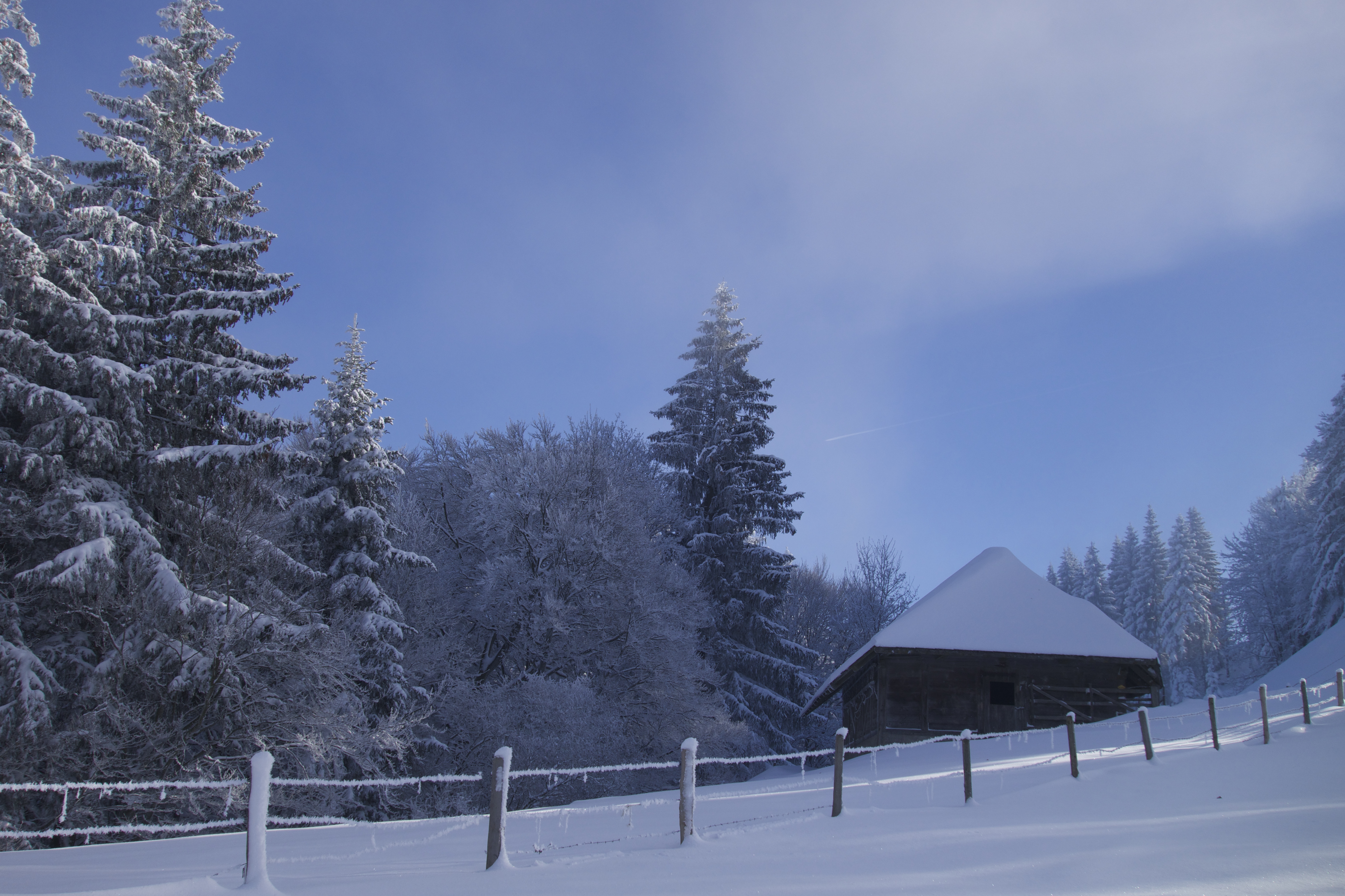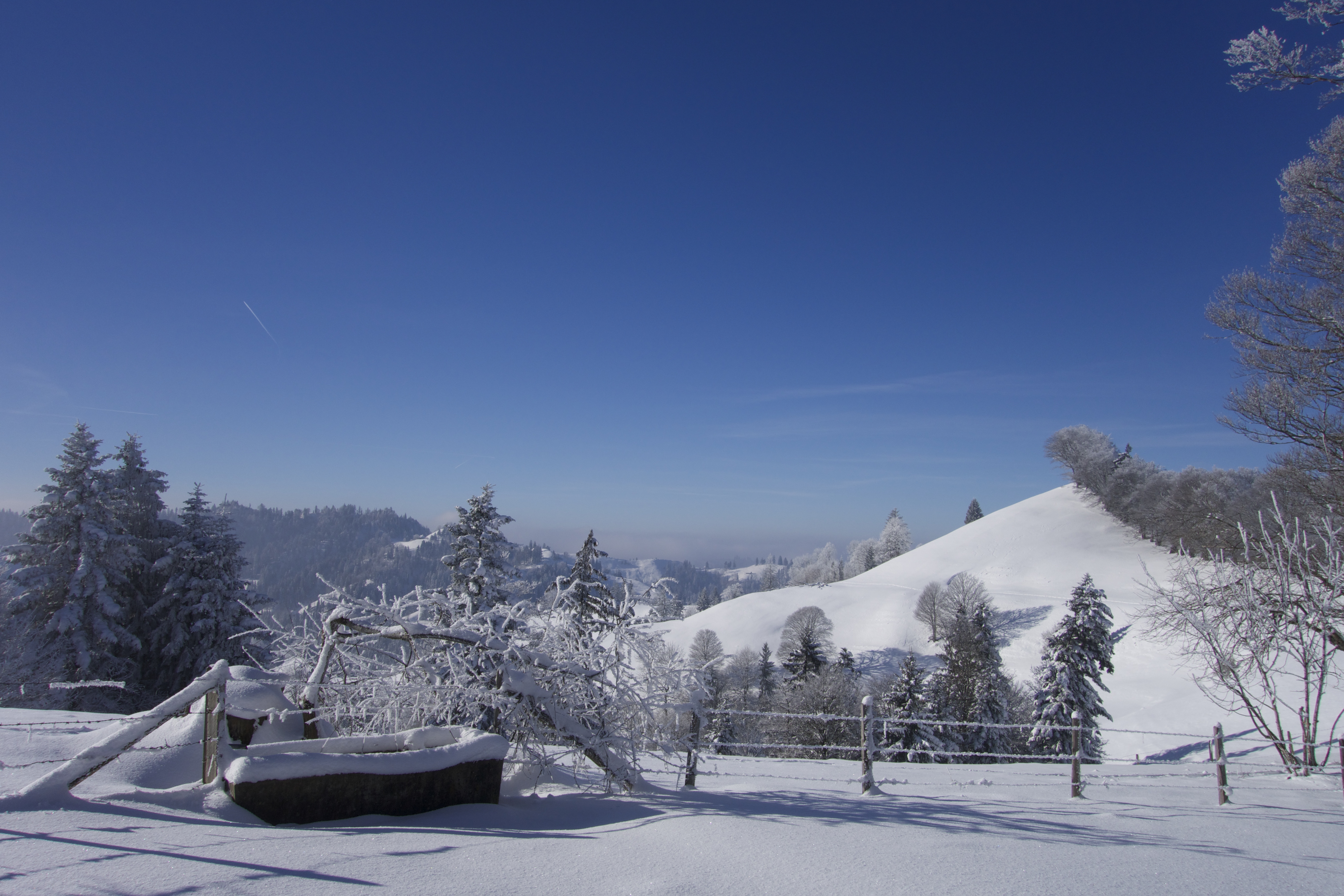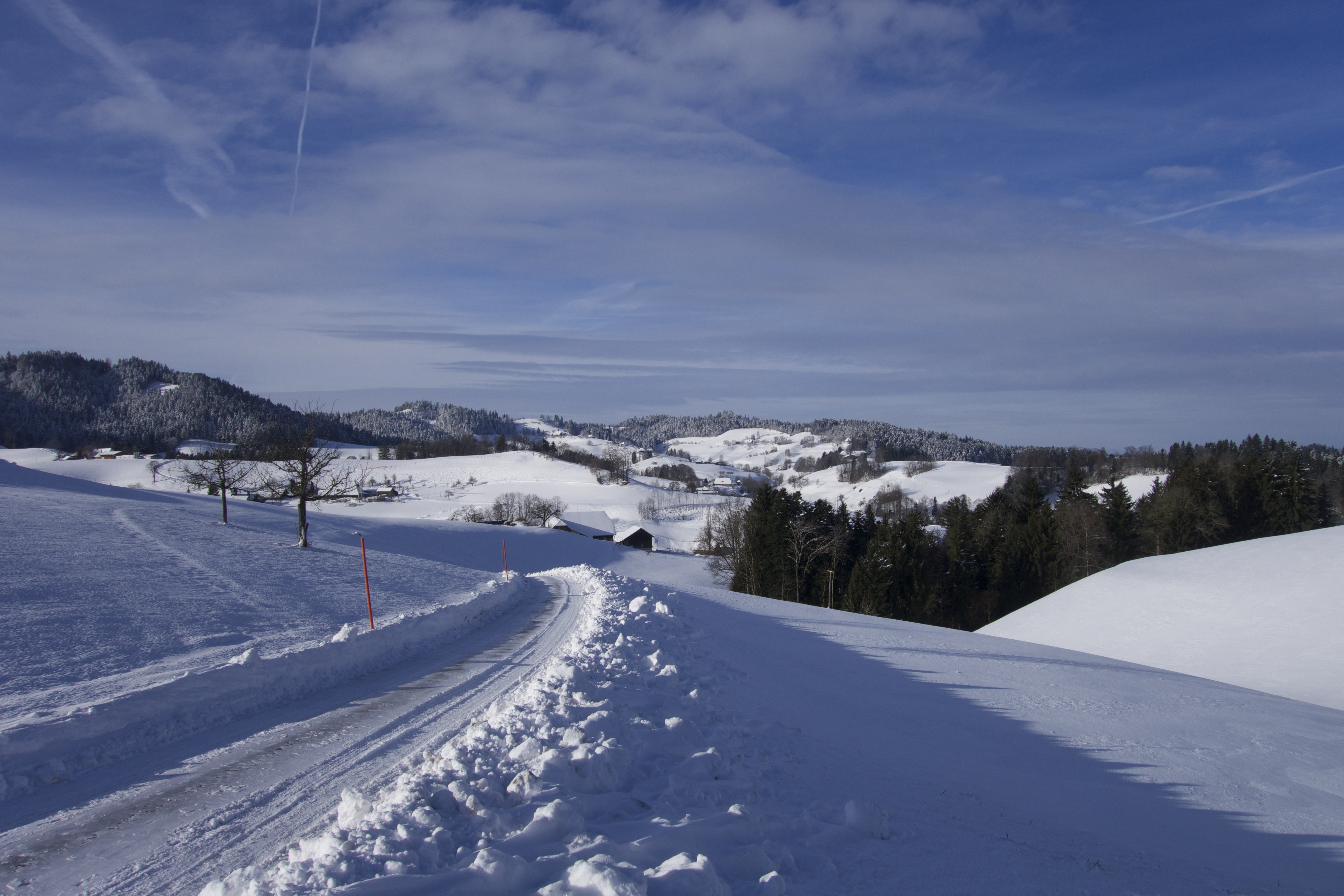 Wandern im Winter. Nirgends geht das besser als im EMMENTAL. Viel Schnee, eine wunderschöne, romantische Landschaft. Stille und Ruhe. Die ideale Gegend, um sich vom Alltag auszuklinken. Bewusst stelle ich mich auf die Lautlosigkeit ein. Jedes Geräusch nimmt man hier wahr. Einen bellenden Hofhund, der sein Revier verteidigt. Weit entfernt eine Motorsäge. Ein Trecker, der von einem abgelegen Hof weg tuckert. Die Kirchenglocken, und ab und zu ein Auto.