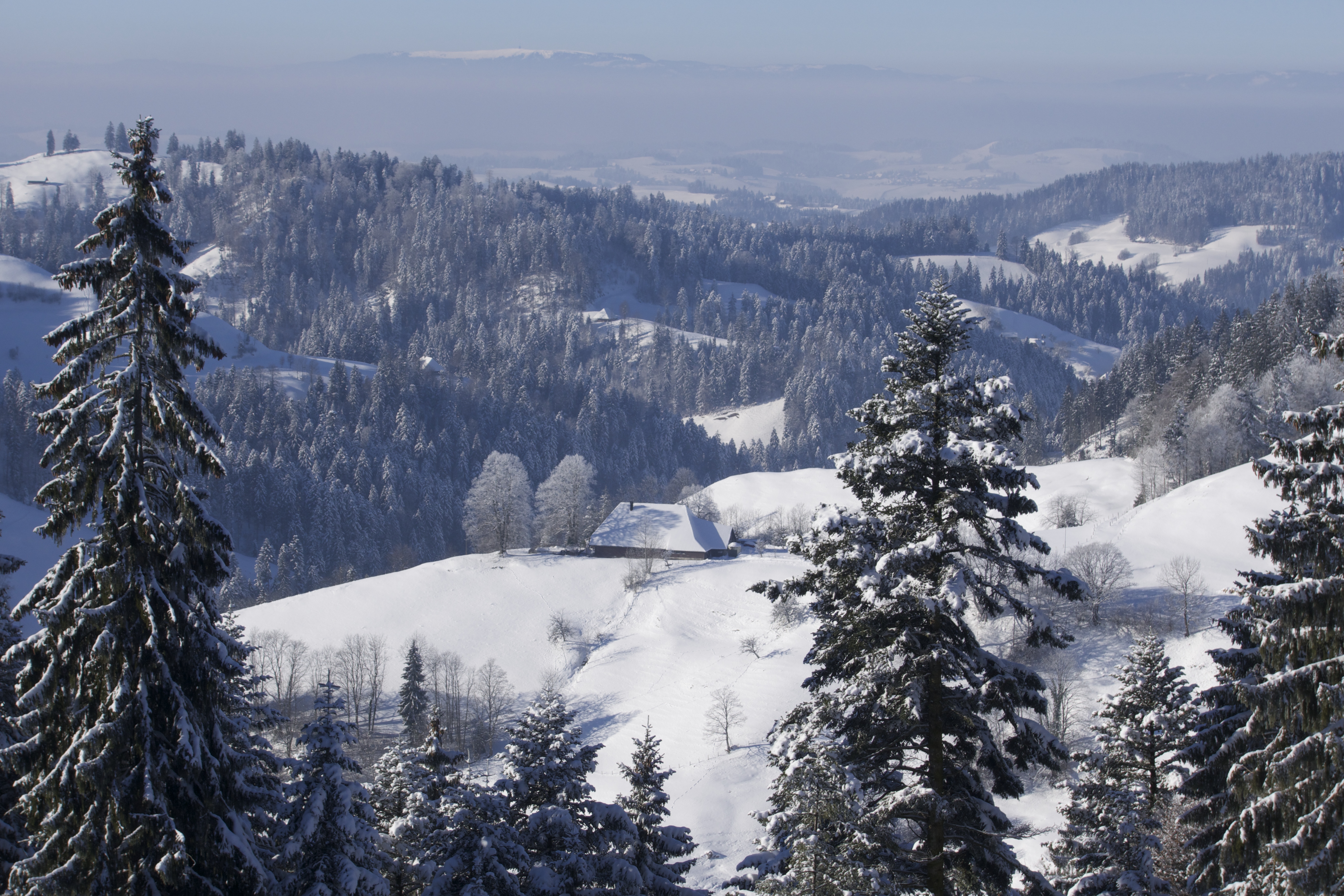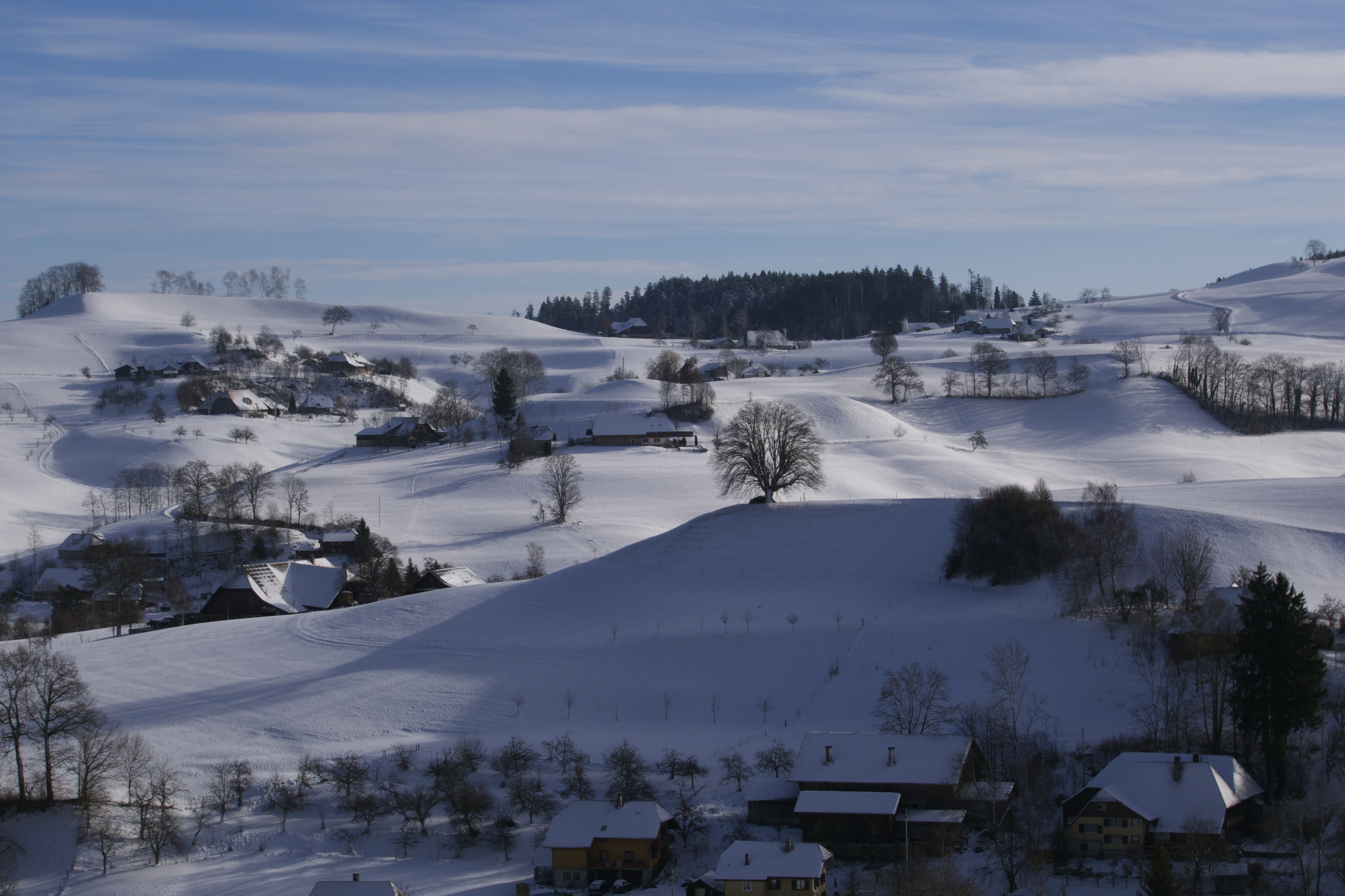 Die kalte Luft scheint jeden Klang weit und klar über das Land zu tragen. Es gibt hier kaum Verkehrslärm. Und nachts ist es dunkel wie in einem Kuhmagen. Gefühlt scheinen hier Tage und Stunden länger zu dauern. Das muss an der Landschaft liegen. Die sanfte, hügelige Hoflandschaft des EMMENTALS weckt Heimatgefühle. Die mächtigen, schneebedeckten Dächer strahlen Geborgenheit aus. Wer hier geboren wurde, kehrt immer wieder zurück. Er lässt einen Teil seines Herzens hier.